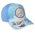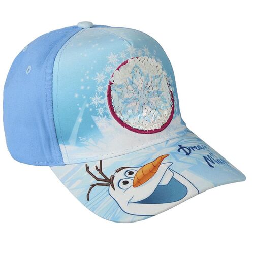 Ένα πανέμορφο καλοκαιρινό καπέλο, σχεδιασμένο με τις αγαπημένες ηρωίδες : Άννα και Έλσα, από τη δημοφιλή ταινία " Frozen " ! Το καπέλο στην περιοχή του κεφαλιού είναι γαλάζιου χρώματος, το μπροστινό μέρος είναι ανοικτό γαλάζιο και πάνω σε παγιέτα απεικονίζεται η Έλσα, γυρνώντας τη φορά της παγιέτας, εμφανίζεται η Άννα ! Το καπέλο διαθέτει γείσο, όπου πάνω του απεικονίζεται ο χιονάνθρωπος, Ολάφ, η λειτουργικότητα του γείσου είναι για την προστασία του προσώπου, από τον ήλιο. Στο πίσω μέρος του καπέλου υπάρχει αυξομειωτικό λουράκι, με την μορφή Κριτς-Κρατς, ώστε να εφαρμόζει σωστά στο κεφάλι.