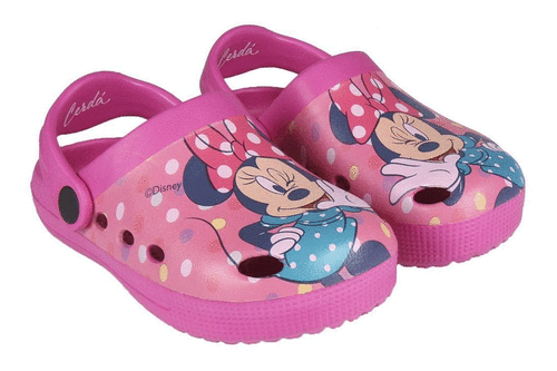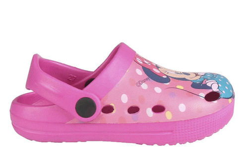 Η Minnie, απεικονισμένη σε σαμπό τύπου Crocs, σε ροζ φόντο και με ροζ λουράκι. Ιδανικά για το παιχνίδι, την πισίνα,την παραλία, το σπίτι και τις παιδικές δραστηριότητες.
