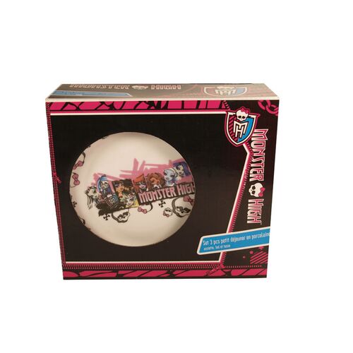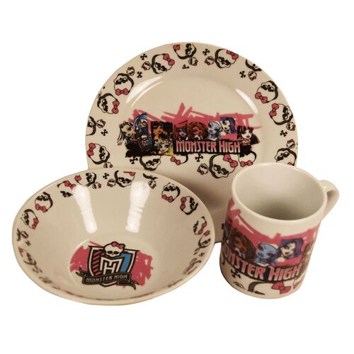 Ένα σετ πρωινού με τις ηρωίδες από τη δημοφιλή σειρά " Monster High " ! Το σετ περιλαμβάνει : ένα πιάτο, ένα μπολ για τα δημητριακά και μία κούπα.Το σετ είναι τοποθετημένο σε κουτί προβολής.