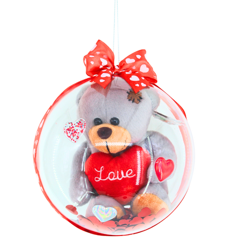 Ένα χαριτωμένο αρκουδάκι κρατάει στα χέρια του μία κόκκινη καρδιά, όπου πάνω της αναγράφεται η φράση " Love" μέσα σε μια διάφανη μπάλα με πολλές καρδίες ! Ένα γλυκύτατο δώρο για τη γιορτή των ερωτευμένων !