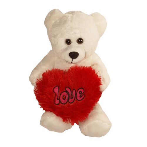 Ένα χαριτωμένο λευκό αρκουδάκι κρατάει στα χέρια του μία κατακόκκινη καρδιά από γούνα, όπου πάνω της αναγράφεται η λέξη: " Love " ! Ένα γλυκύτατο δώρο για τη γιορτή των ερωτευμένων !
