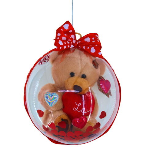 Περιλαμβάνει ένα μπεζ λούτρινο αρκουδάκι που κρατάει μια κόκκινη καρδιά με μήνυμα αγάπης, τοποθετημένο μέσα σε διάφανη μπάλα διακοσμημένη με καρδιές.