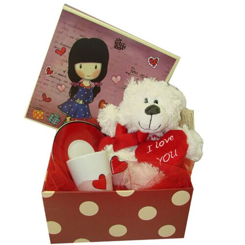 Ένα υπέροχο δώρο για τη γιορτή του Αγίου Βαλεντίνου. Μέσα σε ένα κουτί δώρου με υπέροχα σχέδια είναι τοποθετημένα ένα αρκουδάκι και ένα φλιτζάνι του καφέ με καρδούλες. Απολαύστε το ρομαντικά τον καφέ σας !