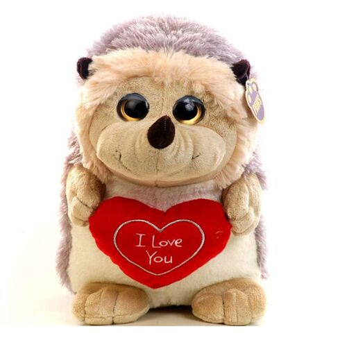 Ο λούτρινος σκαντζόχοιρος έχει πλαστικά μάτια και στα χέρια του κρατάει μια καδιά που γράφει "I love you"