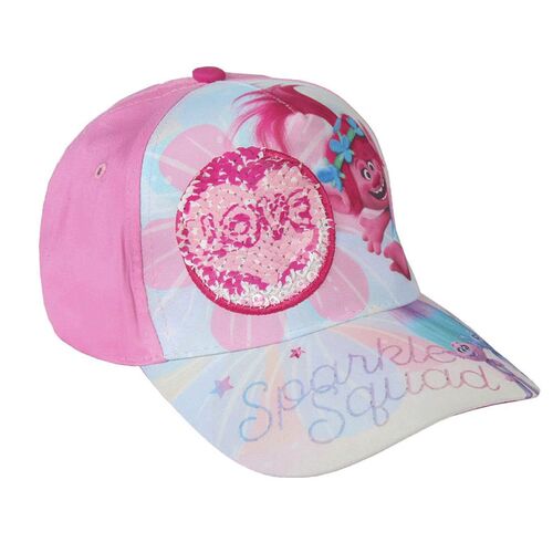Ένα πανέμορφο καπέλο με την Poppy από τα " Trolls " ! Το καπέλο στην περιοχή του κεφαλιού είναι ροζ χρώματος, στο μπροστινό μέρος απεικονίζεται η Poppy και σε παγιέτα το μαλλί της Πόπης, η οποία αλλάζοντας τη φορά της, παρουσιάζει τη λέξη "LOVE " ! Το καπέλο διαθέτει γείσο, η λειτουργικότητα του είναι για την προστασία του προσώπου, από τον ήλιο. Στο πίσω μέρος του καπέλου υπάρχει αυξομειωτικό λουράκι φούξια χρώματος, με τη μορφή Κριτς-Κρατς, ώστε να εφαρμόζει σωστά στο κεφάλι.