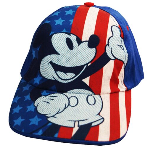 Ένα πανέμορφο καπέλο με τον αγαπημένο ήρωα Mickey Mouse ! Το καπέλο στην περιοχή του κεφαλιού είναι χρώματος μπλε, στο μπροστινό μέρος απεικονίζεται ο Mickey πάνω σε σημαία της Αμερικής. Το καπέλο διαθέτει γείσο, η λειτουργικότητα του είναι για την προστασία του προσώπου από τον ήλιο. Στο πίσω μέρος του καπέλου υπάρχει αυξομειωτικό λουράκι κόκκινου χρώματος, με την μορφή Κριτς-Κρατς, ώστε να εφαρμόζει σωστά στο κεφάλι.