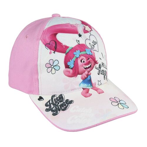 Ένα πανέμορφο καλοκαιρινό καπέλο, σχεδιασμένο με την αγαπημένη ηρωίδα Poppy από τα Trolls ! Το καπέλο στην περιοχή του κεφαλιού είναι ροζ χρώματος, στο μπροστινό μέρος απεικονίζεται η Poppy. Το καπέλο διαθέτει γείσο, η λειτουργικότητα του είναι για την προστασία του προσώπου από τον ήλιο. Στο πίσω μέρος του καπέλου υπάρχει αυξομειωτικό λουράκι, με την μορφή Κριτς-Κρατς, ώστε να εφαρμόζει σωστά στο κεφάλι.
