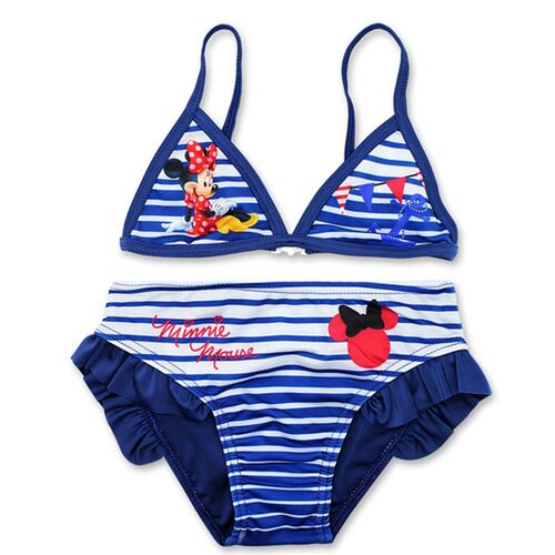 Ένα κοριτσίστικο μαγιό μπικίνι, ριγέ μπλε, με την Minnie ! Στο πάνω μέρος του μαγιό, απεικονίζεται η Minnie σε ριγέ μπλε-άσπρο φόντο. Το κάτω μέρος είναι σλιπ ριγέ μπλε-άσπρο, μπροστά και πίσω έχει πλούσιο μπλε βολάν, το πίσω μέρος είναι μπλε. Ιδανικό για την παραλία, αλλά και για τις αθλητικές δραστηριότητες όλον τον χρόνο!