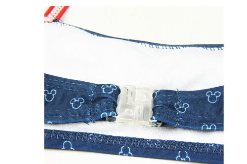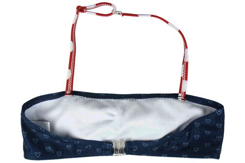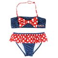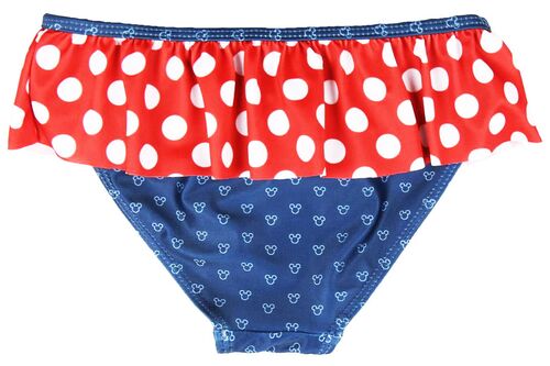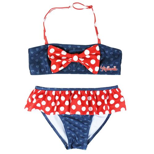 Ένα κοριτσίστικο μαγιό μπικίνι με την Minnie ! Το πάνω μέρος του μπικίνι είναι στράπλες και έχει πουά ράντα, η οποία μπαίνει πίσω από το κεφάλι. Το κάτω μέρος είναι σλιπ χρώματος μπλε σκούρο και έχει πλούσιο βολάν κόκκινο με λευκό πουά Ιδανικό για την παραλία, αλλά και για τις αθλητικές δραστηριότητες όλον τον χρόνο!