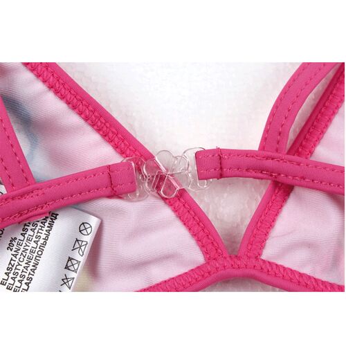 Το μαγιό είναι Ροζ, στο πάνω μέρος του απεικονίζονται από τη μια η Ωραία Κοιμωμένη και από τη άλλη η Χιονάτη και έχει βολάν, το πίσω μέρος κλείνει με πλαστικό- διαφανές κούμπωμα για μαγιό. Το κάτω μέρος του μαγιό είναι ροζ σλιπ μπροστά απεικονίζονται η Χιονάτη, Σταχτοπούτα και Πεντάμορφη, στο πίσω μέρος του έχει πλούσιο βολάν.