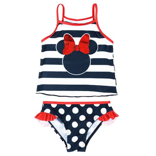 Ένα κοριτσίστικο μαγιό τανκίνι με την Minnie ! Το πάνω μέρος είναι μπλουζάκι ριγέ λευκό με μπλε σκούρο και απεικονίζεται η Minnie Mouse. Το κάτω μέρος είναι σλιπ πουά και έχει κόκκινο βολάν. Ιδανικό για την παραλία, αλλά και για τις αθλητικές δραστηριότητες όλον τον χρόνο!