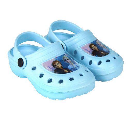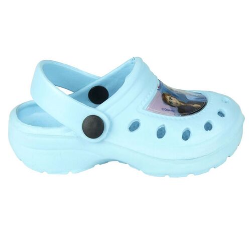 Οι ηρωίδες της Disney, Έλσα και Άννα, απεικονισμένες σε παιδικά σαμπό τύπου Crocs, σε γαλάζιο φόντο με μοβ λουράκι. Ιδανικά για το παιχνίδι, την παραλία, το σπίτι και τις παιδικές δραστηριότητες.