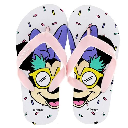 Η ηρωίδα της Disney, απεικονισμένη σε σαγιονάρες, σε λευκό φόντο με διάσπαρτες χρωματιστές καραμέλες κι έχει ροζ λουράκι. Οι σαγιονάρες είναι ιδανικές για το παιχνίδι, την παραλία, το σπίτι και τις παιδικές δραστηριότητες.