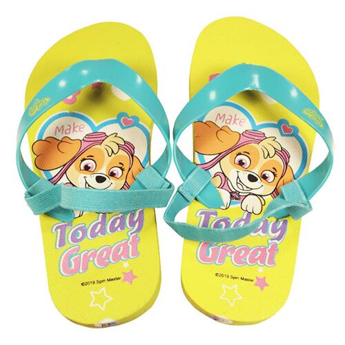 H Skye από τα "Paw Patrol", απεικονισμένη σε παιδικές σαγιονάρες, σε λαχανί χρώμα, το οποίο προσαρμόζεται πίσω από τη φτέρνα για περισσότερη σταθερότητα στο περπάτημα. Ιδανικές για το παιχνίδι, την παραλία, το σπίτι και τις παιδικές δραστηριότητες.