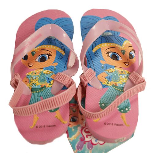 Η Shine, απεικονισμένη σε σαγιονάρες, σε ροζ φόντο με ροζ λουράκι, το οποίο προσαρμόζεται πίσω από τη φτέρνα για περισσότερη σταθερότητα. Ιδανικές για το παιχνίδι, την παραλία, το σπίτι και τις παιδικές δραστηριότητες.