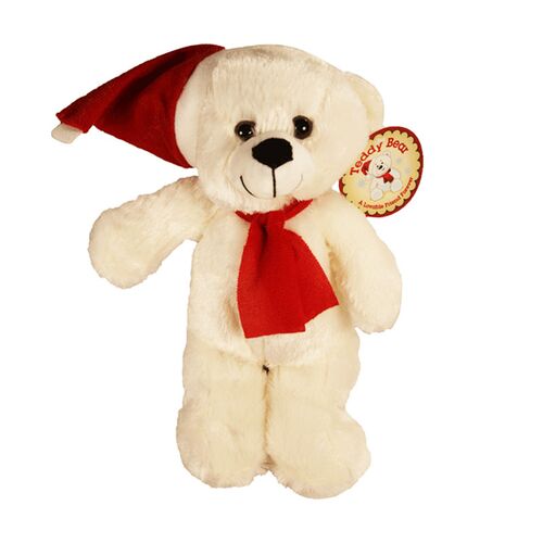 Ένα υπέροχο αρκουδάκι λευκού χρώματος, φοράει το σκούφο του Άγιου Βασίλη ! Ο αρκούδος επίσης φοράει στο λαιμό του, ένα κόκκινο κασκόλ . Ένα χαριτωμένο δώρο για τις γιορτές των Χριστουγέννων !