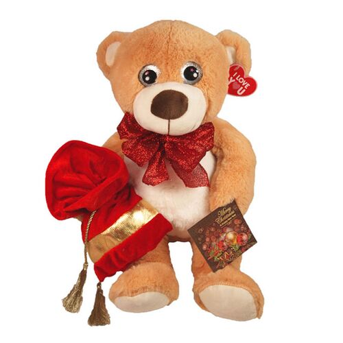 Ένα χαριτωμένο αρκουδάκι κρατάει στο χέρι του ένα χριστουγεννιάτικο μήνυμα, κρατάει ένα κόκκινο-χρυσό πουγκί και στο λαιμό του έχει έναν γυαλιστερό κατακόκκινο φιόγκο ! Ένα γλυκύτατο δώρο για τις γιορτές των Χριστουγέννων !