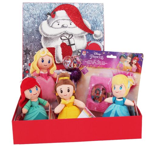 Το σετ περιλαμβάνει 4 λούτρινα παιχνίδια με τις πριγκίπισσες της Disney και ένα ημερολόγιο με στυλό, ιδανικό για χριστουγεννιάτικη διακόσμηση ή δώρο.