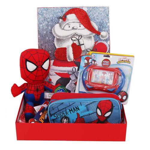 Το σετ περιλαμβάνει: λούτρινο Spiderman, παιχνίδι Ring Water Game και κασετίνα με σχέδιο Spiderman — όλα σε χριστουγεννιάτικη διάθεση.