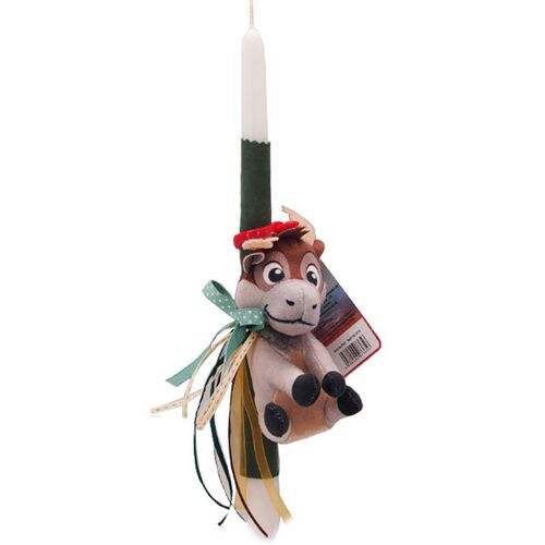 Το κερί είναι στολισμένο με κορδέλες και διάφορα διακοσμητικά και το λούτρινο είναι σταθερά τοποθετημένο πάνω στο κερί. Η λαμπάδα είναι τοποθετημένη σε κουτί προβολής της σύνθεσης.