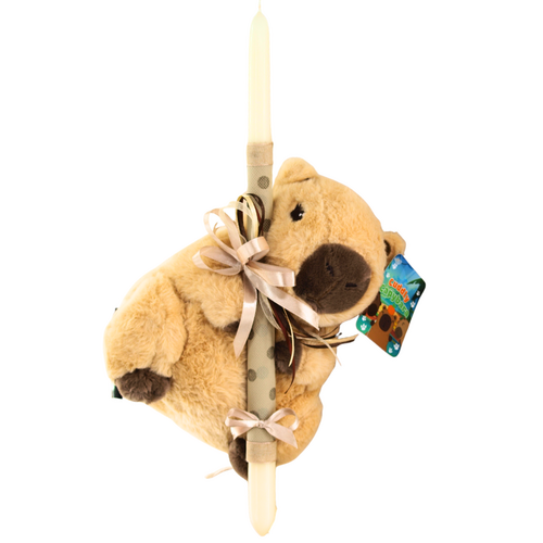 Η πασχαλινή λαμπάδα συνοδεύεται από ένα λούτρινο Capybara σε μπεζ χρώμα με ύψος περίπου 20 cm, τοποθετημένο πάνω στο κερί και διακοσμημένο με πασχαλινά στοιχεία και κορδέλες.