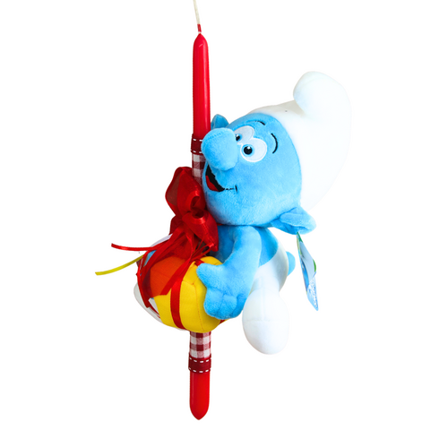 Η λαμπάδα περιλαμβάνει ένα μεγάλο λούτρινο στρουμφάκι γνωστό ως “Χαχανιούλης” Smurfs τοποθετημένο πάνω στο κερί. Το κερί είναι στολισμένο με κορδέλες και πασχαλινά διακοσμητικά που δημιουργούν μια εντυπωσιακή πασχαλινή σύνθεση.