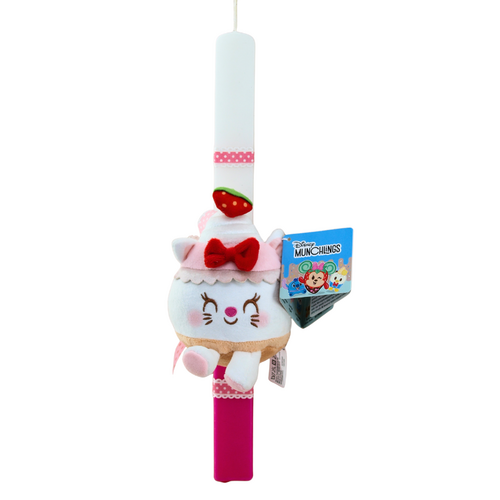 Η πασχαλινή λαμπάδα συνοδεύεται από ένα λούτρινο μπρελόκ Marie Cheesecake Φράουλα, μέρος της σειράς Disney Munchlings — μια συλλογή μικρών λούτρινων σε στυλ γλυκών που μεταμορφώνουν αγαπημένους χαρακτήρες σε χαριτωμένα σχέδια.