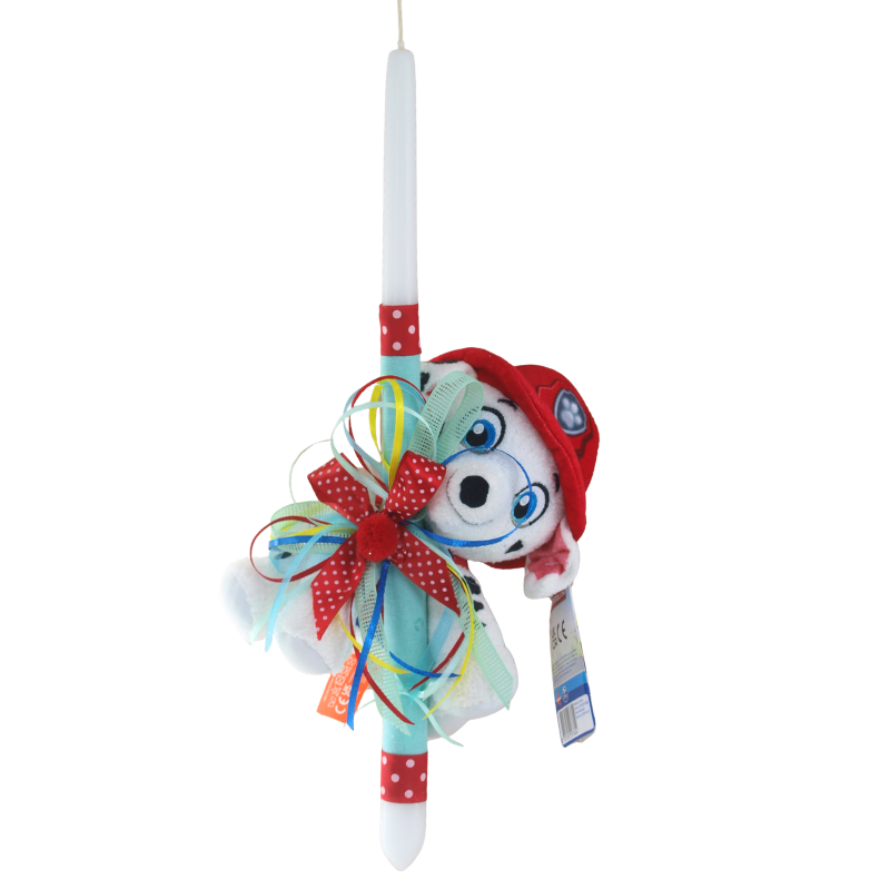 Η λαμπάδα συνοδεύεται από λούτρινο του Marshall, του αγαπημένου πυροσβέστη της ομάδας Paw Patrol, διακοσμημένο με στοιχεία καρδιών και προσεγμένες λεπτομέρειες, δημιουργώντας ένα ολοκληρωμένο πασχαλινό δώρο.