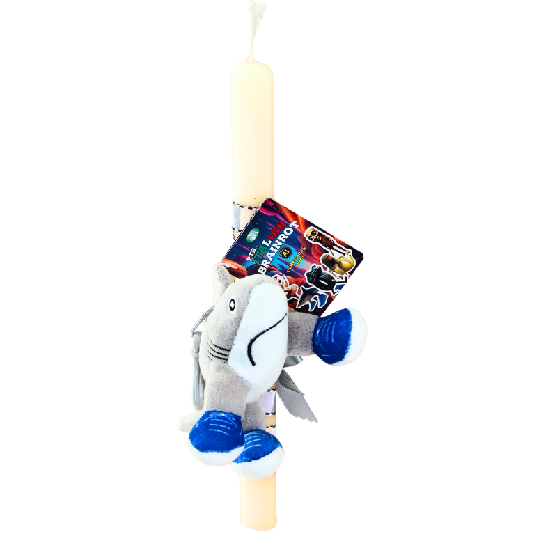 Αυτή η πασχαλινή λαμπάδα έχει στολισμένο κερί με κορδέλες και διακοσμητικά στοιχεία, και συνοδεύεται από λούτρινο μπρελόκ Tralalero Tralala Καρχαρία ύψους περίπου 10 cm, σταθερά τοποθετημένο πάνω στο κερί.