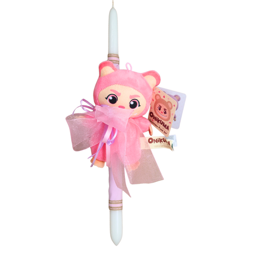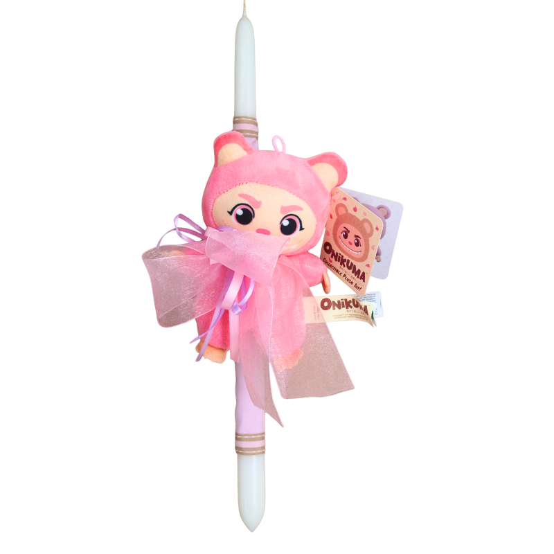 Η λαμπάδα περιλαμβάνει ένα διακοσμημένο πασχαλινό κερί με στολισμό και ένα ροζ φιγούρα Onikuma λούτρινο ύψους περίπου 18 cm, ιδανικό για χαρούμενες πασχαλινές στιγμές.