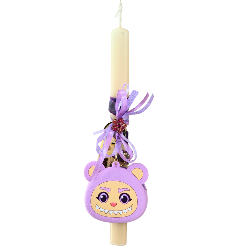 Η λαμπάδα διακοσμείται με λούτρινο στοιχείο και μωβ αποχρώσεις που την καθιστούν ελκυστική για τα παιδιά και μια όμορφη επιλογή δώρου από νονές και νονούς για το Πάσχα.