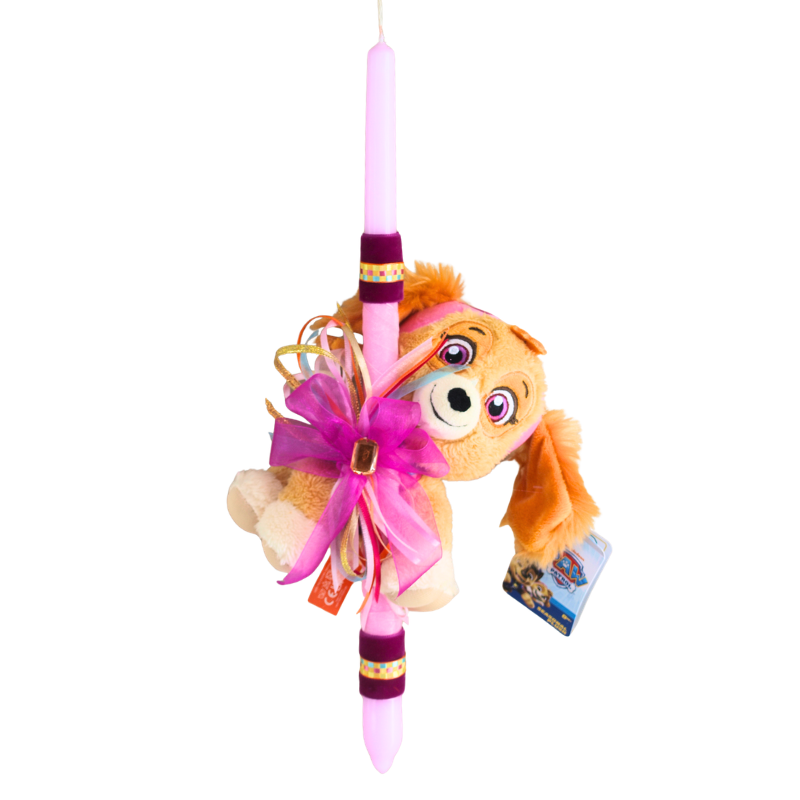 Η λαμπάδα συνοδεύεται από ένα λούτρινο της Skye, της αγαπημένης ηρωίδας του Paw Patrol, διακοσμημένο με μοτίβα καρδιών και προσεγμένες λεπτομέρειες, δημιουργώντας ένα τρυφερό και χαρούμενο πασχαλινό δώρο.