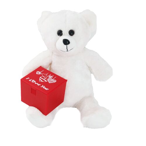 Η άσπρη αρκούδα κρατάει στα χέρια της ένα κόκκινο κουτάκι, όταν ανοίγει πετάγεται μια κόκκινη καρδιά