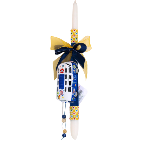 Τα διάσημα Volkswagen Bus τώρα και σε λαμπάδα! Το κερί είναι στολισμένο με κορδέλες και διάφορα διακοσμητικά, το Volkswagen Bus είναι σταθερά τοποθετημένο πάνω στο κερί. Η λαμπάδα είναι τοποθετημένη σε κουτί προβολής της σύνθεσης. Πρόκειται για ένα μεταλλικό van με ήχο και φως