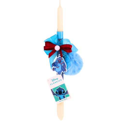 Το κερί είναι στολισμένο με κορδέλες και γαλάζιο πομ πομ μπρελόκ stitch είναι είναι σταθερά τοποθετημένο πάνω στο κερί
