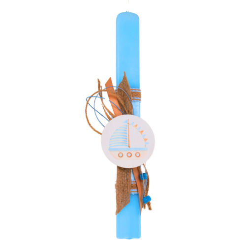 Πασχαλινή Λαμπάδα Γαλάζια πλακέ κερί με Διακοσμητικό ξύλινο καραβάκι 30εκ