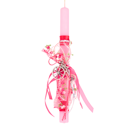 Πασχαλινή Λαμπάδα ροζ οβάλ κερί με Διακοσμητικό μεταλλικό ποδηλατάκι