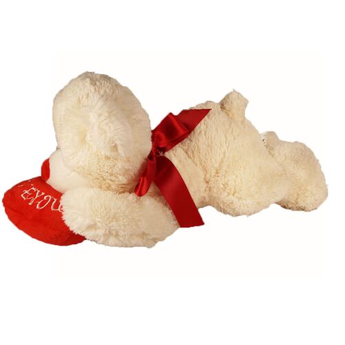 Ένας χαριτωμένος αρκούδος ξαπλωτός, μπεζ χρώματος με κόκκινη μυτούλα και κόκκινο φιόγκο στο λαιμό, ακουμπάει το κεφαλάκι του πάνω σε μία κόκκινη καρδιά-μαξιλάρι, όπου πάνω της αναγράφεται η φράση: "I Love You". Πρόκειται για ένα μαλακό και ελαφρύ λούτρινο που φωλιάζει ευχάριστα στην αγκαλιά!