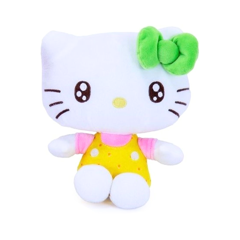 Είναι ένα λούτρινο Hello Kitty ύψους περίπου 16 cm με κίτρινη πουά φόρμα και πράσινο φιόγκο, ιδανικό για αγκαλιά και παιχνίδι.