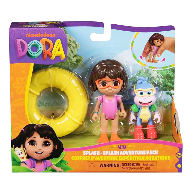 Η περιπέτεια στο νερό γίνεται πραγματικότητα με το σετ περιπέτειας Splash-Splash που περιλαμβάνει τη Ντόρα και τον Μπουνς! Αυτό το σετ διαθέτει φιγούρες κατάλληλες για προσχολικές ηλικίες, με τη Ντόρα και τον Μπουνς ντυμένους με χρωματιστά μαγιό. Η Ντόρα φέρει γυαλιά, φιάλη οξυγόνου και πέδιλα, ενώ ο Μπουνς φοράει γυαλιά και φωσφορίζουσες φλοτίτσες. Οι κεφαλές και τα άκρα τους είναι κινητά, διευκολύνοντας την απεικόνιση παιχνιδιών καθώς κάθονται, στέκονται και κινούνται. Πατώντας το κουμπί στη φιάλη οξυγόνου της Ντόρας, μπορείτε να την δείτε να κλωτσάει! Το σετ περιλαμβάνει επίσης μια μεγάλη κίτρινη σωσίβια με την οποία μπορούν να μοιραστούν, ιδανική για να ενθαρρύνει το παιχνίδι με βάση τη φιλία. Βουτήξτε στον κόσμο της Ντόρα με παιχνίδια για μικρούς εξερευνητές - ιδανικά για μαγικά δώρα γενεθλίων ή πάρτι για αγόρια και κορίτσια που αγαπούν τους ρόλους με κούκλες, αξεσουάρ και έπιπλα κούκλας