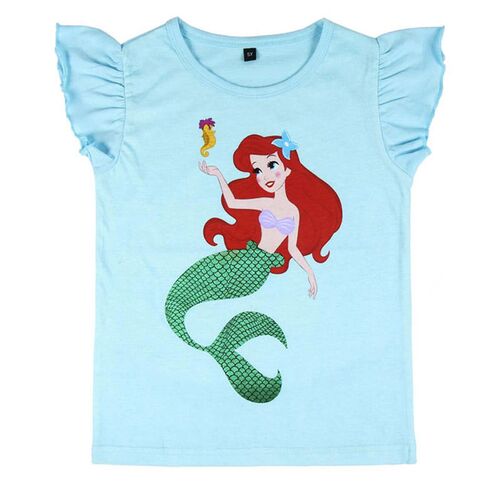 Ένα χαριτωμένο κοντομάνικο μπλουζάκι, με την αγαπημένη γοργόνα των παιδιών Άριελ από τη δημοφιλή ταινία της Diney "Η Μικρή Γοργόνα¨. Το μπλουζάκι είναι βαμβακερό, χρώματος γαλάζιο και μπροστά απεικονίζεται η Άριελ γοργόνα. Τα μανίκια έχουν βολάν και δίνουν μια πιο χαριτωμένη εμφάνιση. Το πίσω μέρος της μπλούζας είναι γαλάζιο,