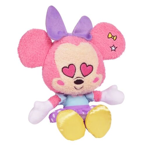 Η Λούτρινη Minnie Mouse είναι ροζ με καρδούλες για μάτια και φοράει γαλάζιο μπλουζάκι και μοβ πουά φούστα.