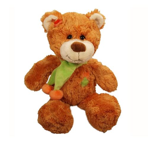 Ένας χαριτωμένος αρκουδάκι καφέ ανοικτού χρώματος με πράσινο-πορτοκαλί κασκόλ στο λαιμό. Πρόκειται για ένα μαλακό και ελαφρύ λούτρινο που φωλιάζει ευχάριστα στην αγκαλιά!