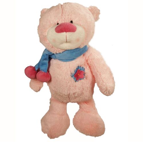 Ένας χαριτωμένος αρκούδος ροζ χρώματος, με ένα γαλάζιο-ροζ λουλούδι στο μέρος της καρδιάς, φοράει ένα γαλάζιο-ροζ κασκόλ. Πρόκειται για ένα μαλακό και ελαφρύ λούτρινο που φωλιάζει ευχάριστα στην αγκαλιά!