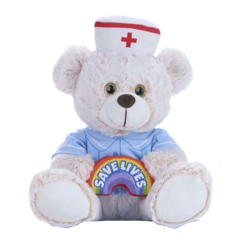 Ένα υπέροχο λούτρινο αρκουδάκι σε μπεζ χρώμα, ντυμένο νοσοκόμα με μήνυμα "Save Lives" ! Τα ματάκια του είναι αστραφτερά ασημένια με glitter.Ένα λούτρινο που φωλιάζει ευχάριστα στην αγκαλιά!