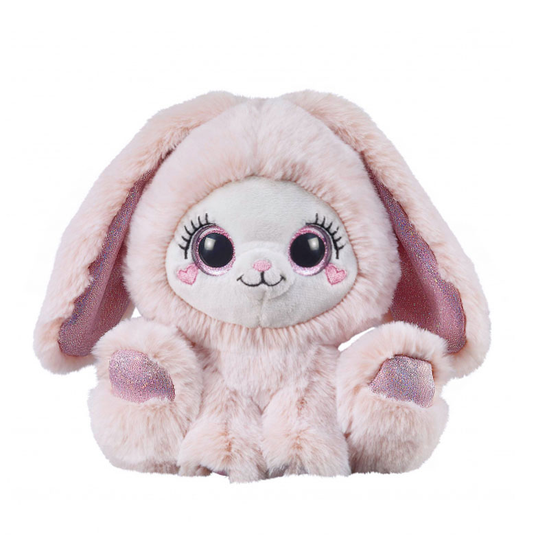 Είναι ένα καθιστό λούτρινο λαγουδάκι σε ροζ χρώμα με γκλίτερ λεπτομέρειες — τέλειο για αγκαλιά ή διακόσμηση.
