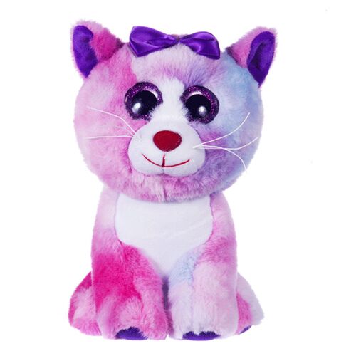 Γατούλα με μεγάλα μοβ γυαλιστερά μάτια. Η γατούλα είναι στις αποχρώσεις του μοβ-ροζ-γαλάζιου χρώματος, το εσωτερικό των αυτιών της είναι μοβ, ενώ η μουσούδα της και η κοιλιά της είναι λευκού χρώματος. Το ζωάκι φοράει ένα μοβ σατέν φιόγκο στο κεφάλι. Πρόκειται για ένα μαλακό και ελαφρύ λουτρινο που φωλιάζει ευχάριστα στην αγκαλιά! Τα μάτια του είναι πλαστικά και έχει απαλή γούνα.