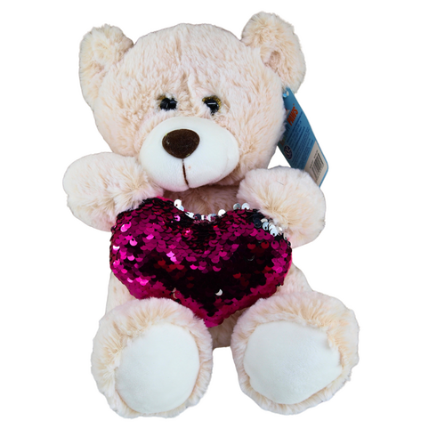 Αρκούδα Μπεζ με Sequin Φούξια Ασημί Καρδιά Λούτρινο 25cm