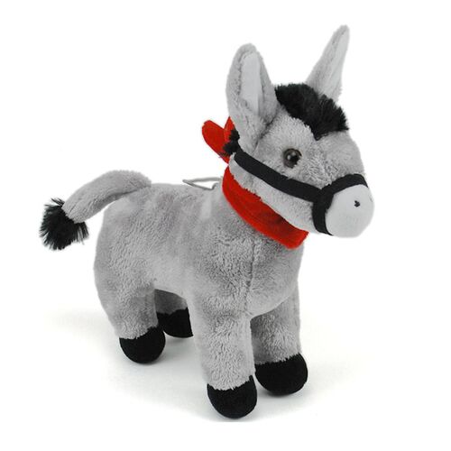 Το λούτρινο γαϊδούρι φοράει ένα κόκκινο φουλάρι στο λαιμό και μαύρο σαμάρι.