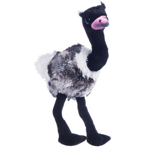 Μία στρουθοκάμηλος με μεγάλα γαλανά γυαλιστερά μάτια. Η στρουθοκάμηλος είναι μαύρου χρώματος στο λαιμό και στα πόδια, το σώμα της είναι άσπρο με γκρι και το ράμφος της είναι ροζ. Πρόκειται για ένα μαλακό και ελαφρύ λουτρινο που φωλιάζει ευχάριστα στην αγκαλιά! Τα μάτια του είναι πλαστικά και έχει απαλή γούνα.